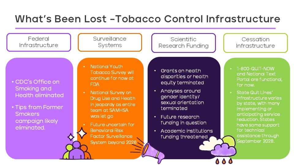 On April 1, 2025, the U.S. Department of Health and Human Services (HHS) announced sweeping cuts that have profound impacts on federal tobacco control efforts. Many foundational systems supporting tobacco use prevention, cessation, research, and public education have been substantially reduced or eliminated entirely.