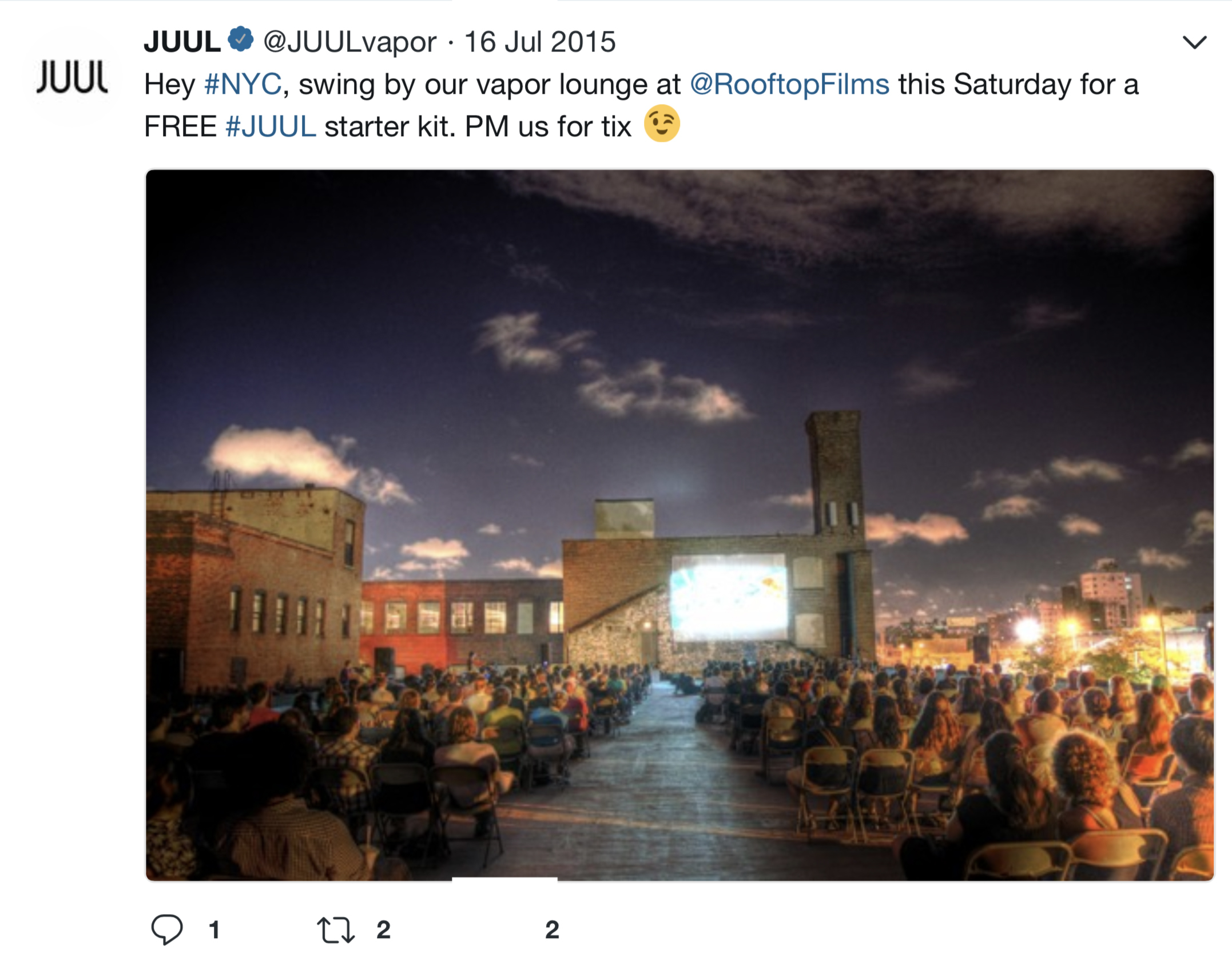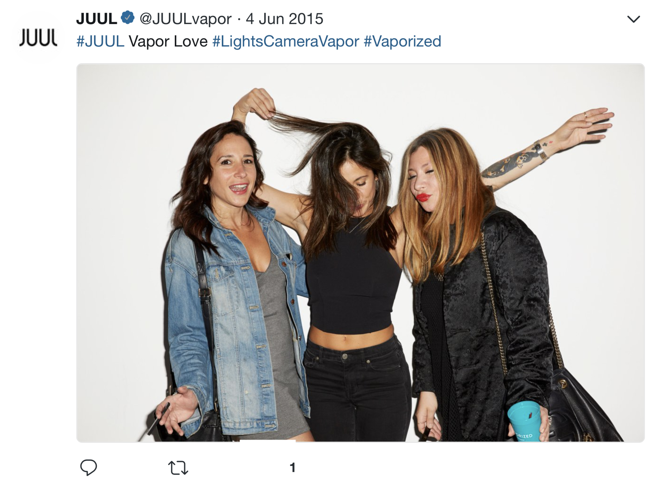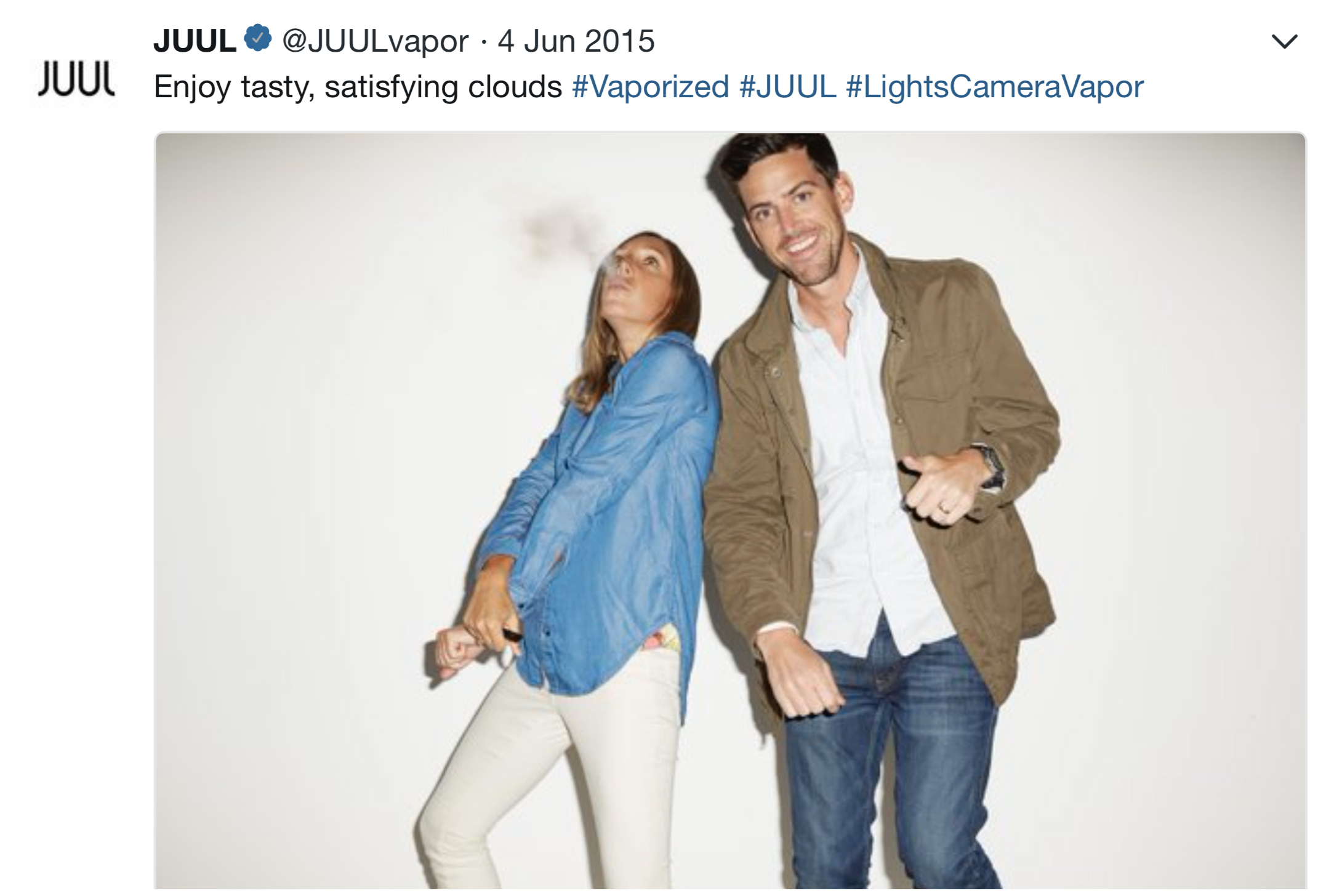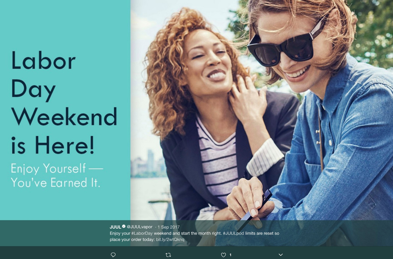 Many examples of JUUL’s early Twitter marketing strategy being youth-focused exist, including a collection of JUUL ads and promotional activities compiled by Stanford Research Into the Impact of Tobacco Advertising. Researchers at Stanford University found that “JUUL’s advertising imagery in its first six months on the market was patently youth-oriented” and the company used traditional tobacco industry advertising themes that may draw adolescents to smoking.