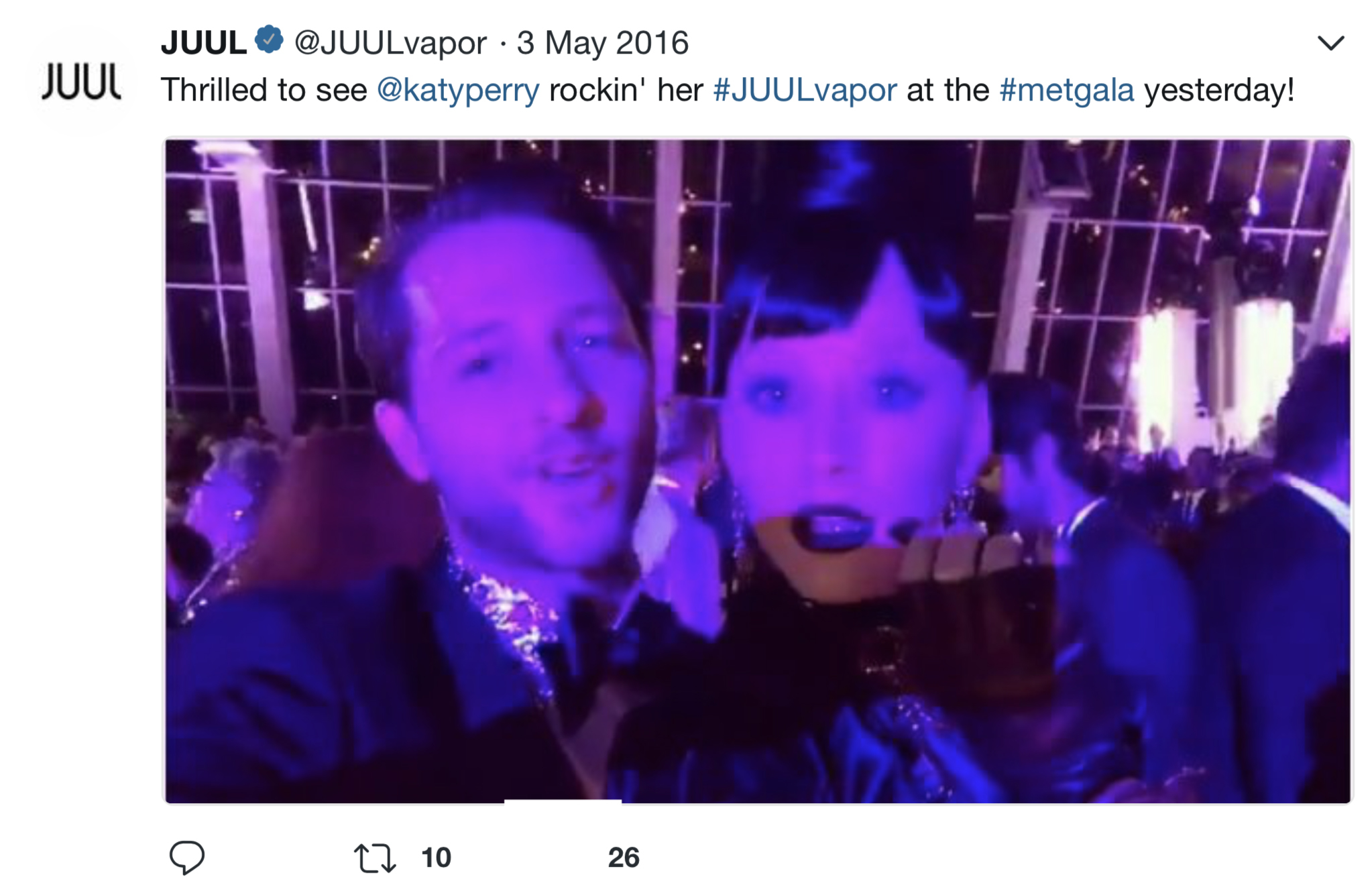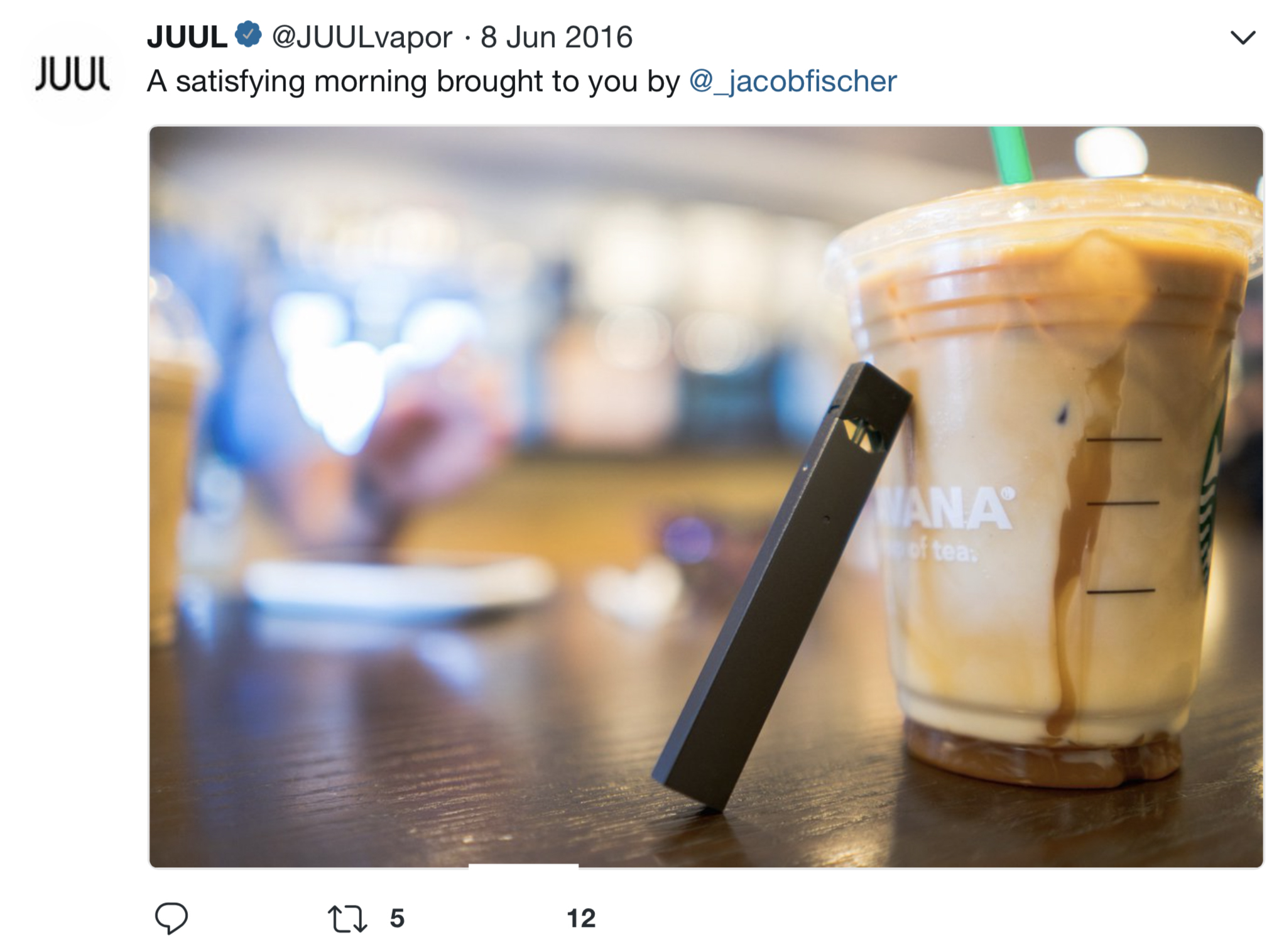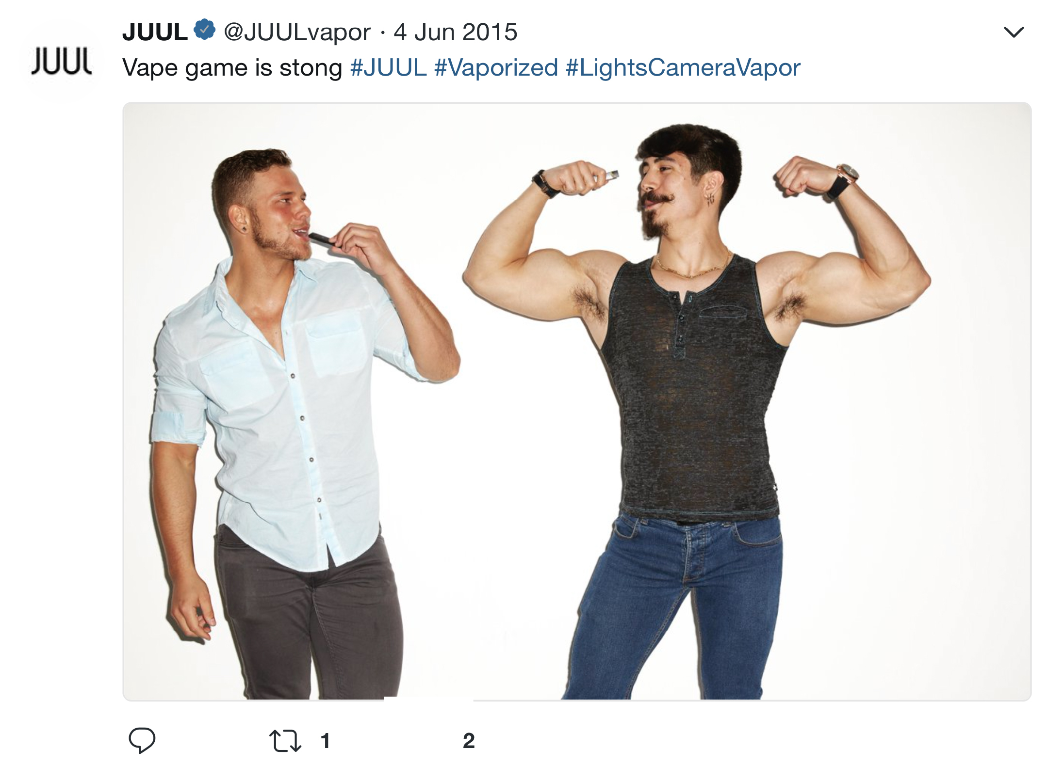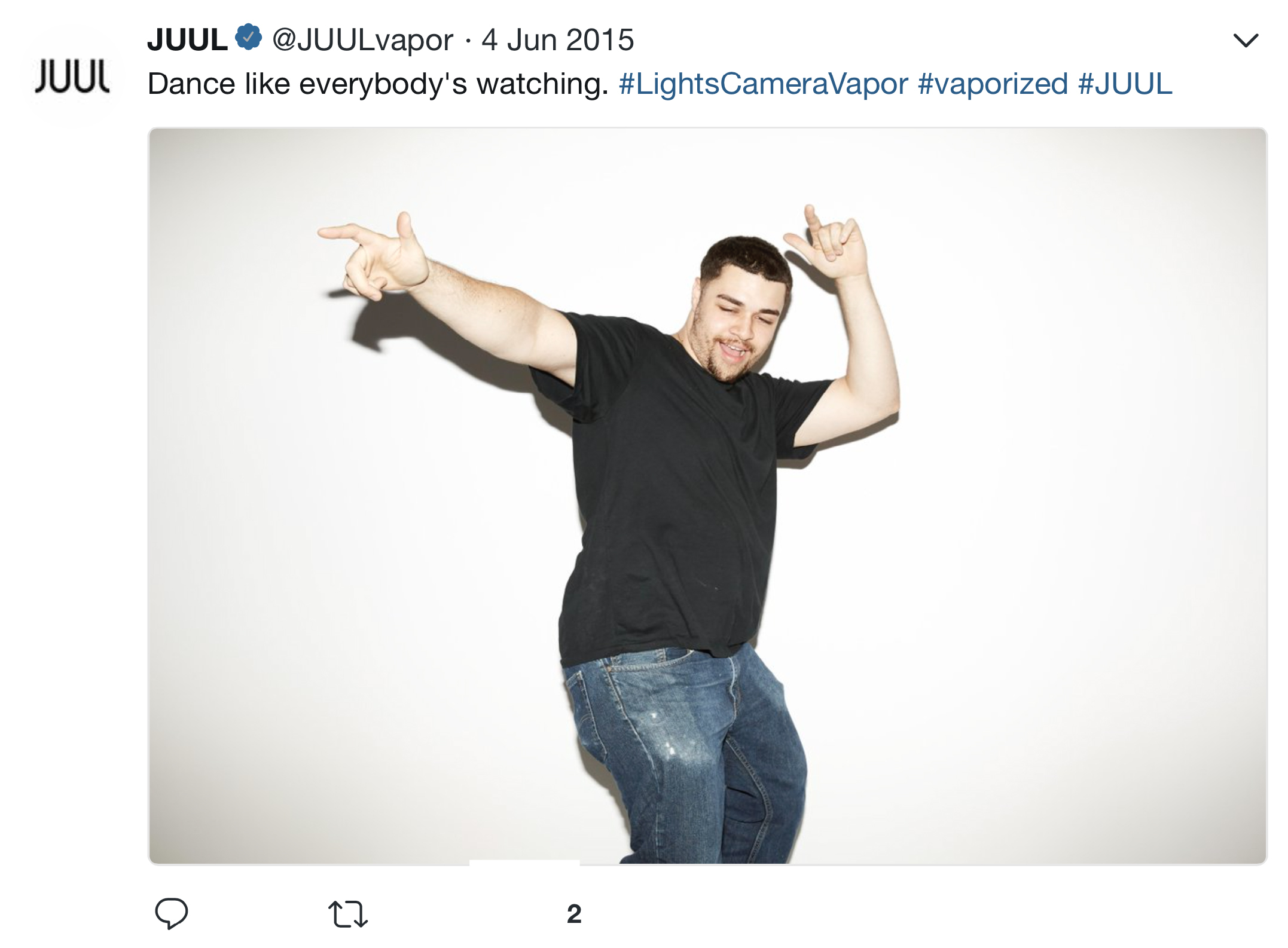 Many examples of JUUL’s early Twitter marketing strategy being youth-focused exist, including a collection of JUUL ads and promotional activities compiled by Stanford Research Into the Impact of Tobacco Advertising. Researchers at Stanford University found that “JUUL’s advertising imagery in its first six months on the market was patently youth-oriented” and the company used traditional tobacco industry advertising themes that may draw adolescents to smoking.