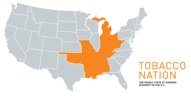 The massive decline in the overall U.S. smoking rate disguises a persistent problem. Some communities have not experienced the same reduction in commercial tobacco use as others, and certain areas of the country continue to use tobacco at disproportionately higher rates. These areas share not only higher tobacco use, but poorer health outcomes and a similar set of challenges — lower income, and less accessible healthcare infrastructure and resources — compounded by a lack of tobacco control policies.