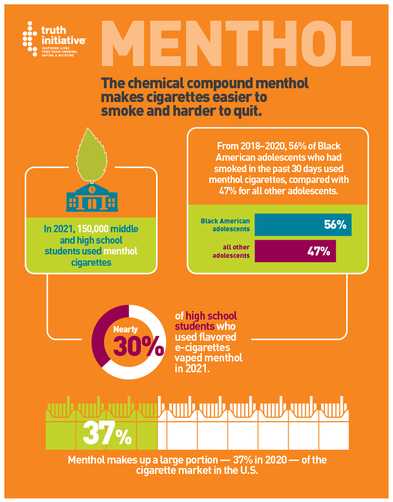 The chemical compound menthol makes cigarettes easier to smoke and harder to quit. Menthol creates a cooling effect, reduces the harshness of cigarette smoke, and suppresses coughing. Those effects may make menthol cigarettes more appealing to young, inexperienced smokers, and research shows that they are more likely to addict youth. Because Black Americans use menthol cigarettes at higher rates, menthol also contributes to health inequities.